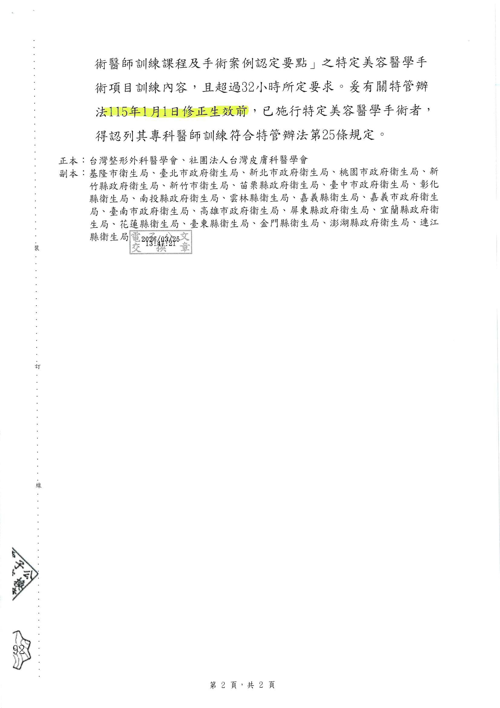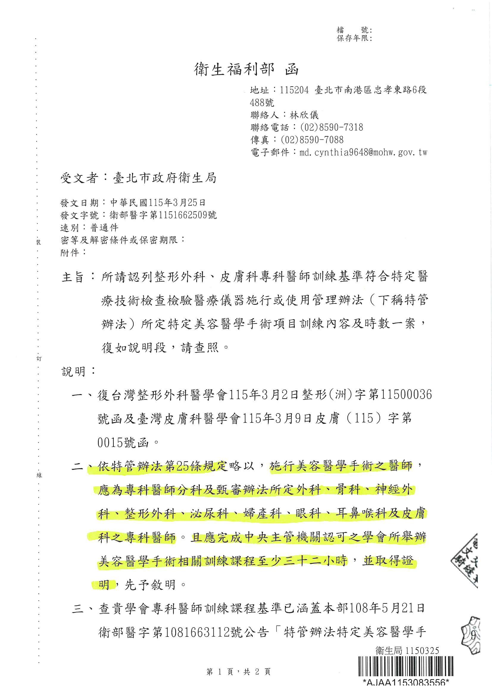 依衛生福利部函文規定,施行特定美容醫學手術之醫師,須為相關專科醫師,並完成經中央主管機關認可之學會所辦理之美容醫學手術訓練課程至少32小時,且取得證明。 本案已明確規範整形外科及皮膚科等專科醫師之訓練基準,相關訓練內容及時數請參閱附件。